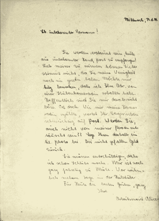 Sie werden erstaunt sein, heute aus unbekannter Hand, Post zu empfangen! Sich meiner zu erinnern können Sie bestimmt nicht, da Sie meine Wenigkeit noch nicht gesehen haben. Möchte nur kurz bemerken, dass ich Ihre Adr. von einer Stubenkameradin erhalten habe. Hoffentlich sind Sie mir darob nicht böse. Od. doch. Wie mir meiner Kameradin erzählte wartet Ihr Lager schon sehnsüchtig auf Post. Werden Sie, auch nicht von meiner Person enttäuscht sein?? Lege Ihnen deshalb ein kl. Photo bei. Bei nicht gefallen Geld zurück.